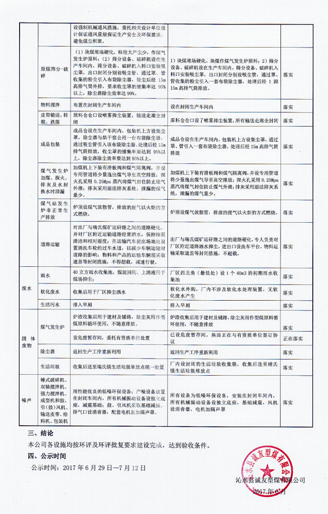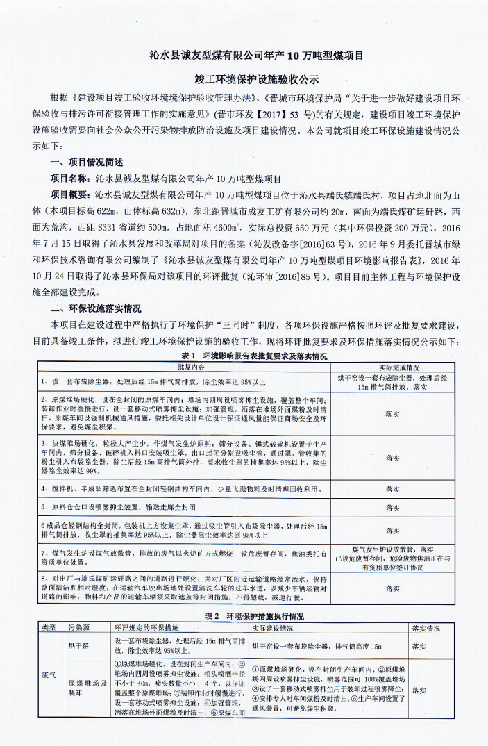 沁水縣誠友型煤有限公司年產(chǎn)10萬噸型煤項目竣工環(huán)境保護設(shè)施驗收公示